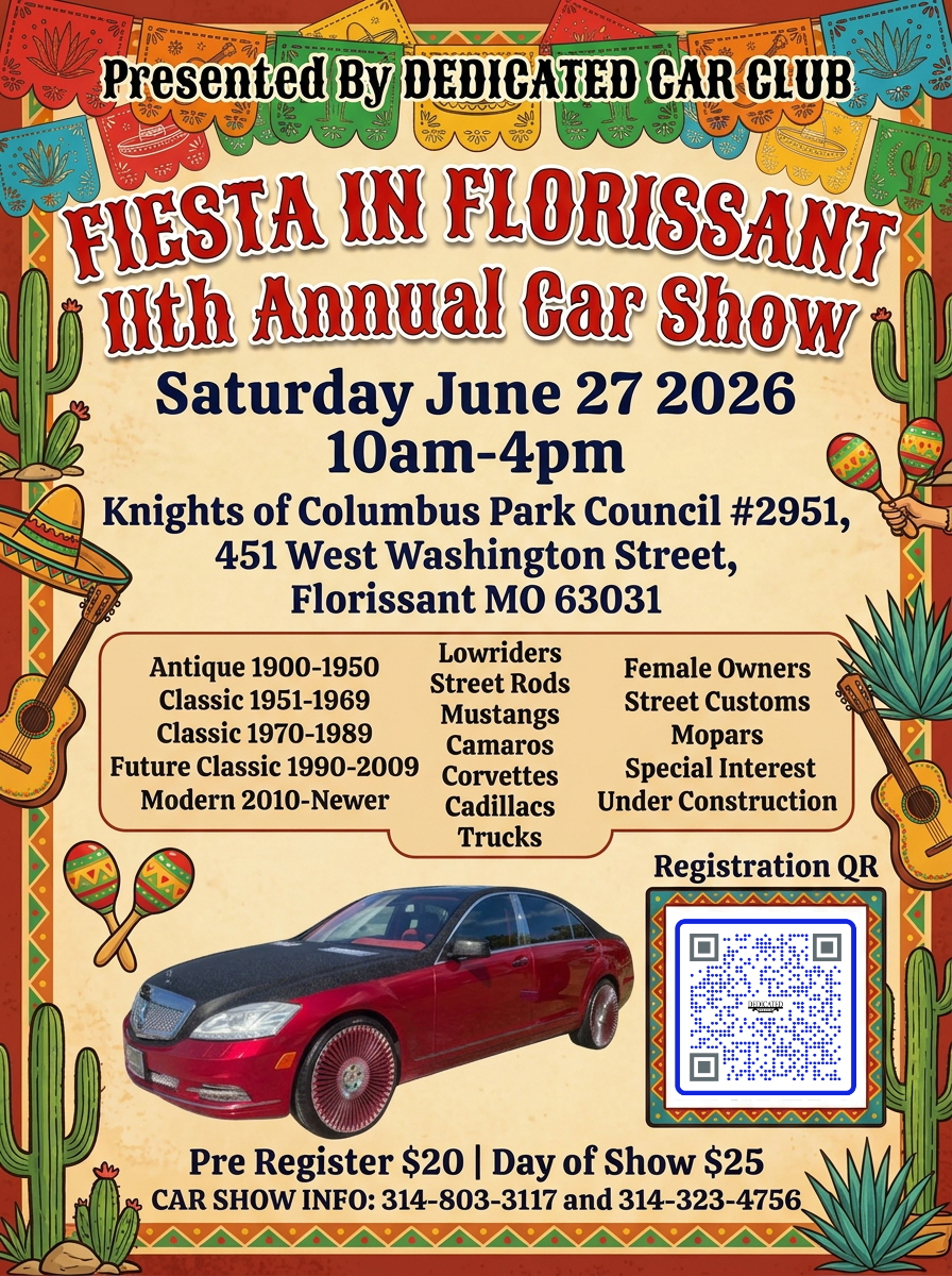 Join us for our 11th Annual Car Show at the Fiesta in Florissant! Held during the Hispanic Festival, this event highlights the rich culture and strong passion for cars. Experience an exciting mix of classic and modern vehicles, connect with fellow enthusiasts, and enjoy a lively atmosphere filled with great music, food, and community spirit. It’s the perfect way to celebrate culture, creativity, and a shared love for cars all in one place.